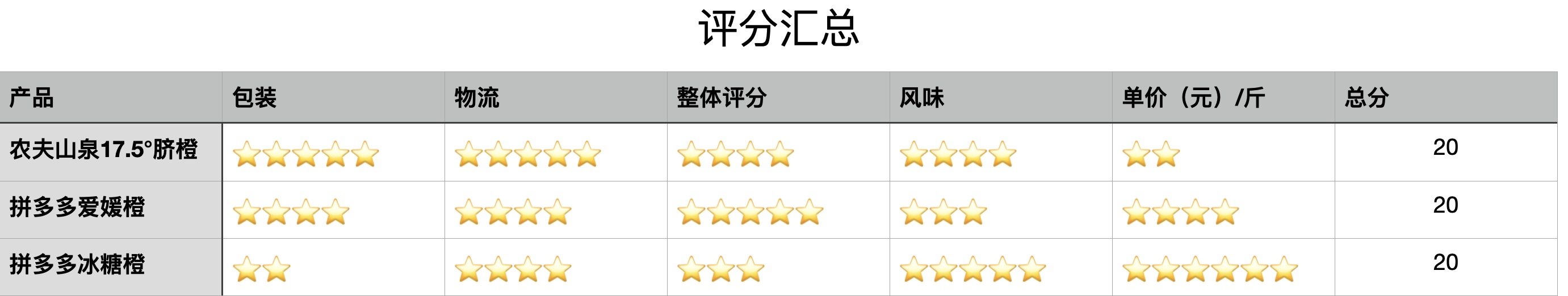 单论外在尺寸,不得不说脐橙还是占了不少优势。但一切开,爱媛橙薄薄的外皮,一下就反超了。而且,老婆大人吃橙子的时候特别不喜欢吃吃中间的橘络,一般吃的时候我也会特地切掉(虽然吃了营养好,但口感确实不咋地)。同样因为需要单独处理冰糖橙中的籽,所以在第一轮橙子打分的时候,两者都会被我扣掉一点点。最终试吃前三者的整体评分如下: